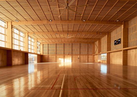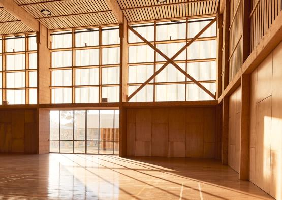 Huon Pine veneered plywood was used as the lower wall lining in the sports hall, with pine boards assembled in cassettes for upper walls and ceilings. For the function centre, yellow stringy bark T&G wall paneling was used.
