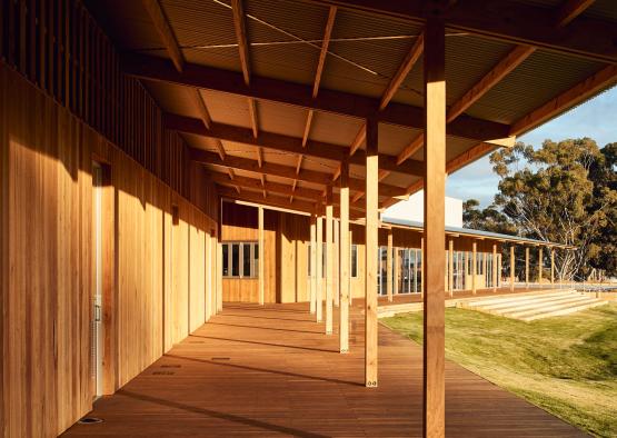External cladding for the centre is plantation grown yellow stringy bark [Eucalyptus muelleriana], in 19mm and in 35mm formats depending on exposure to the elements. The material was grown locally, providing a vast resource to a town that has limited access to building resources. Locally sourced timber also requires less transport, and therefore less emissions in it’s LCA.