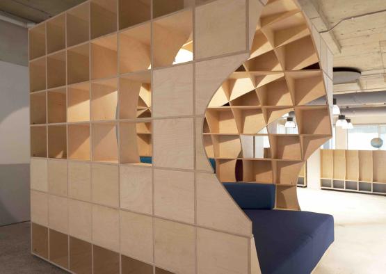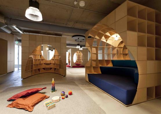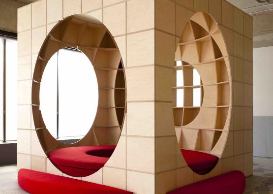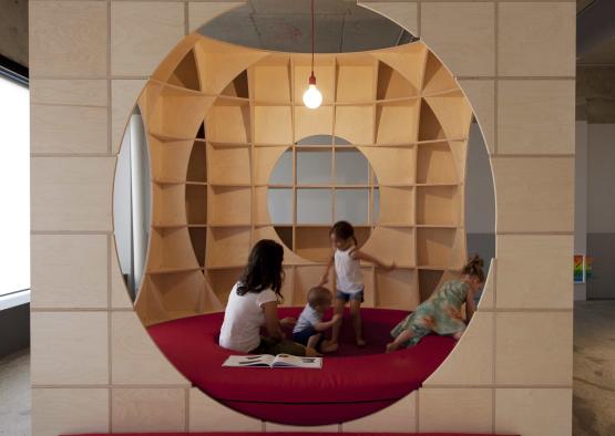 The Play Pods concept was our design response to a childcare centre brief received from our client. Their chosen site was an existing 1960s office building in Sydney. The opportunity we identified enabled us to consolidate a number of brief objectives and associated functions into a singular, hybrid object. This decision would then achieve significant spatial efficiency and as a consequence a positive economical outcome. Four bespoke timber pods have been conceived which incorporate seating, display, storage, enclosure and separation. In addition to the embedded functions the pods themselves serve the additional purpose of subdividing the floor plate into smaller gathering spaces, providing physical, visual and acoustic separation.