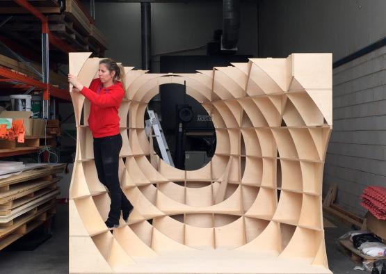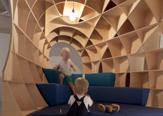 The pods are made completely from intersecting layers of high quality birch plywood. The entire structure is self supporting requiring no additional framing or structure. The significant health benefits of timber for children in a learning environment were also a key factor in selecting timber for the project, (Planet Ark's report Wood - Housing, Health, Humanity). With the physical and psychological health benefits timber possess, the pods aim to promote these assets within the crucial growth environment of the childcare centre. Being able to be disassembled makes the pods re-usable, and they are ultimately completely recyclable.