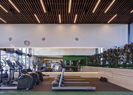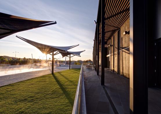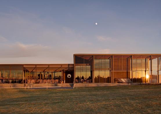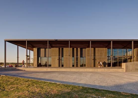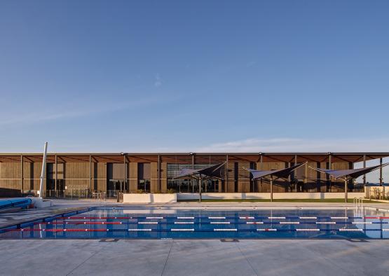 Club Mandalay is a public building that provides the anchor facilities for a new 3,000 home community in Beveridge, north of Melbourne. The building welcomes a wide range of users from golfers finishing a round on the Peter Thomson designed course, to kids using the pool or café, or locals in the gym before work. The design brief called for bold architecture that could stand proud as a backdrop for this community in the years to come without becoming formal or austere. Timber was our go-to pallet for the external cladding, ceilings, floor and much of the custom design furniture. The warmth of natural timber expressed in ceilings and furniture spoke to the welcoming of diverse visitor group, whilst six metre high walls clad in stained ply provide a texture that could bridge the human scale and that of a pavilion building read in the open landscape.