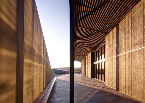 Roof System: Spotted Gum blades were fitted to underside of roof structure to form a dramatic building soffit externally internally to main feature ceiling areas. Various fixing systems were developed and appropriated depending on the requirement to incorporate lighting and ventilation, and also structural depth and exposure to weather. This architecural feature was used to unite internal and external public spaces and promote visual flow between them.