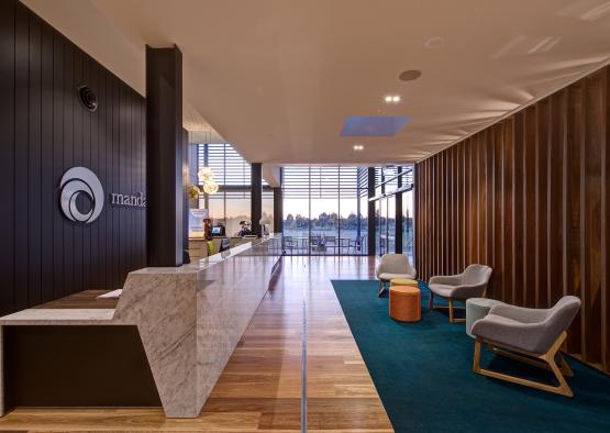 Interior Panelling: Feature grooved wall panels in radiata pine were used behind the reception area to mirror the external cladding.