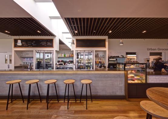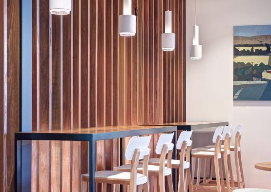 Joinery and Cabinetry: The custom tables used spotted gum with a steel frame. The built-in bar/café counter used a Tasmanian oak counter. A custom timber bladed screen was used in the café area.