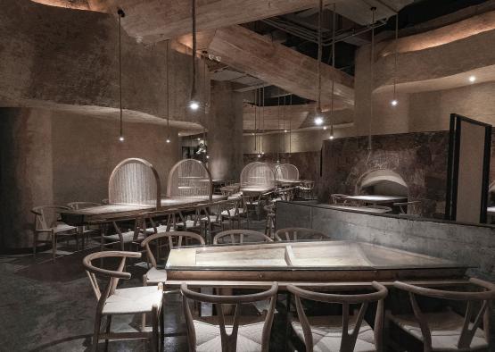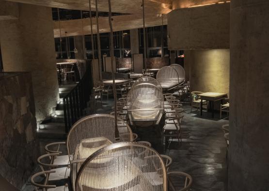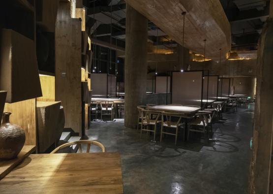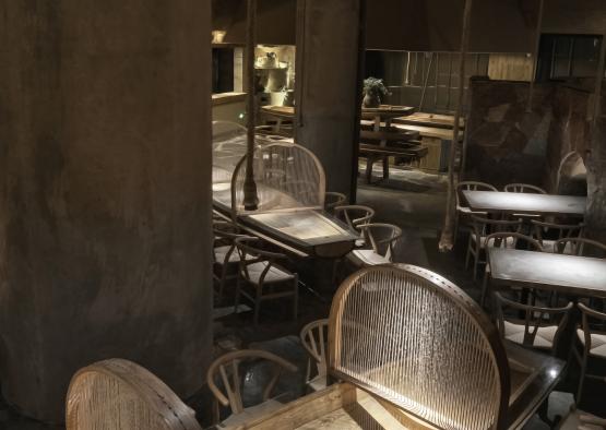 The space planning is interesting, full of changes and well-arranged. Eating on the staggered-floor and overlooking the boats on the water surface makes people think of Jiangnan water towns. A space with great contrast of romantic feeling and primitive simplicity is created. The huge boat on the top and mud wall terraced fields on both shores, together with natural scenes such as the elevated dining area on mountain cableways, rough granite handrail and etc., all reflects and fits the theme perfectly – cooking delicious food with a simple and sincere heart.