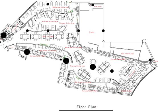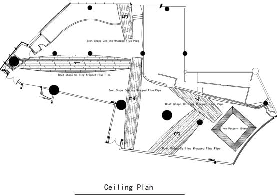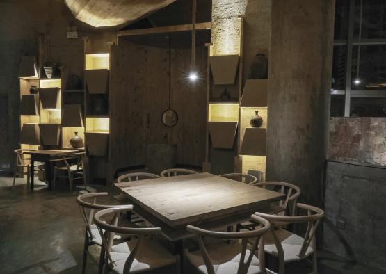The whole restaurant combines with the landscape of a local terrace, cropping to create a primitive and plain feeling. Entering the door, a huge pot and stove is unfolded in front of visitors; it highlights the theme, while entertaining people. A few boats look as if they are drifting leisurely on the waterway of Jiangnan, and a staggered-floor has been added to both shores, making the waterway look like a natural water surface.