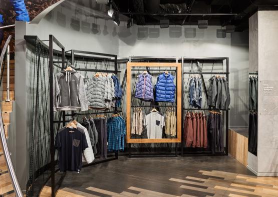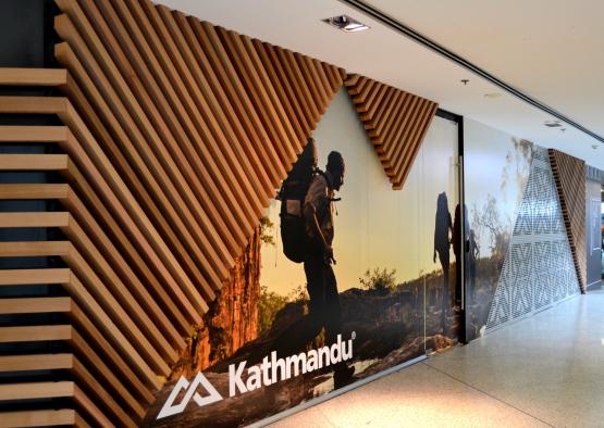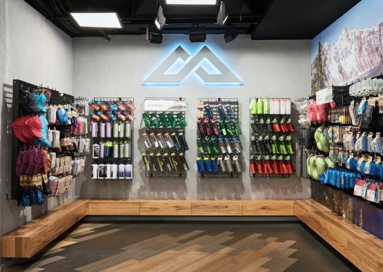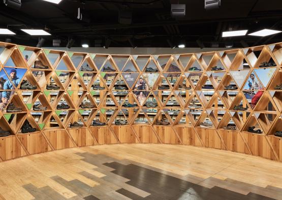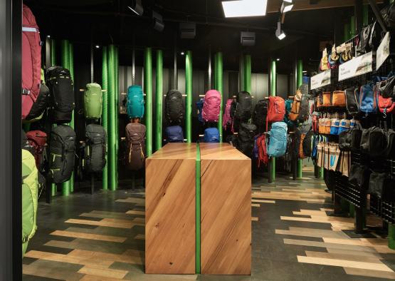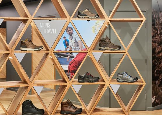 Katmandu's flagship store in Melbourne’s Elizabeth Street heroes timber more than any other material, reflecting the brand ethos by showing a dedication to sustainability, a connection to the outdoors and the use of authentic materials. The shopfront is lined with timber battens that angle together to draw the customer in and under them. The canopy above of intersecting timber beams lines the ceiling whilst the gradient painted timber floor provides the platform for the various retail zones. These two elements work harmoniously together to provide a sense of movement; a changing terrain which is reminiscent of typography found in the natural landscape. Throughout the various themed zones timber has been extensively used, in particular, the ‘Shoe Wall’ where a series of interlocking triangles create niches for display and graphic content.