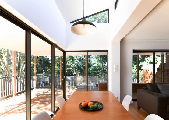 The concept of introducing a modest side addition as the dining room, that opened up to a generous verandah to the North and pool to the East, completely transformed the house. At the transition of the new addition, a south facing highlight window was added to bring a sense of space and drama to the room, defining areas within the open plan space and bring light and views of the tree tops into the room.