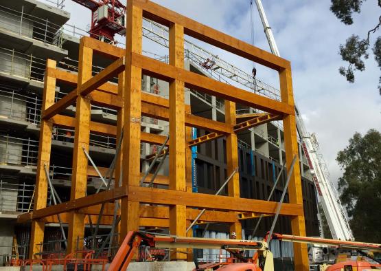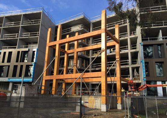 The four-storey post and beam timber structure erected for RMIT’s Bundoora Campus serves as a striking focal point for the University’s newly constructed student accommodation complex. A custom roof framing system was used along with pre-fabricated floor panels, radiata pine LVL beams and columns over eighteen metres in height, making it one of the largest engineered timber structures in Australia. The massive exposed LVL timber beams which can be seen from many levels internally as well as from the street, produce a stunning contrast to the surrounding steel and coasted aluminium cladding and creates a grand yet comfortable interior.