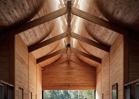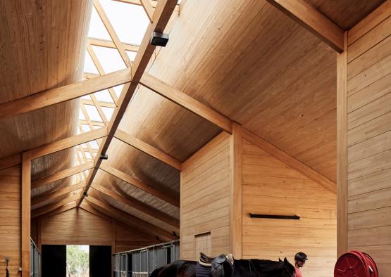 Built with a post and beam style construction found in vernacular barns of the area, the stables utilises the open envelope that results from the technique, but with added rigidity from engineered glue-laminated timber.
