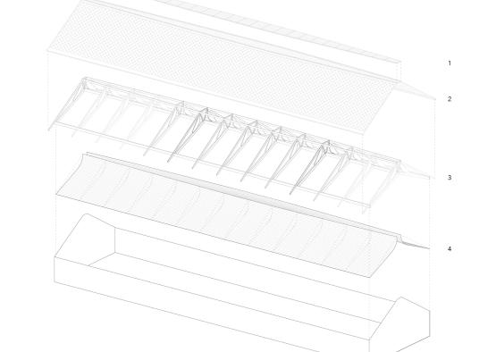 The posts and beams hold up the walls and curved roof, while a seperate truss system supported by the ridge beam creates a firm hold for the skylight. The resulting curved timber roof structure is one of complexity and beauty.