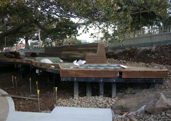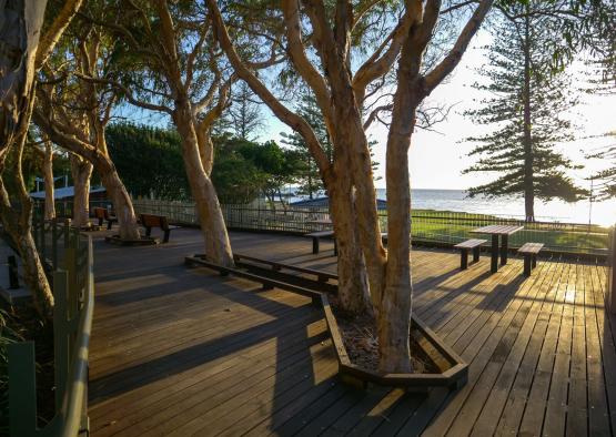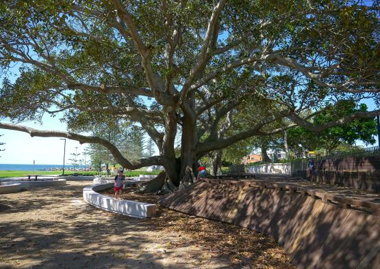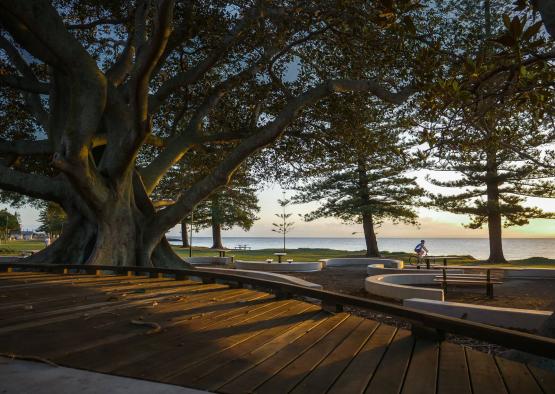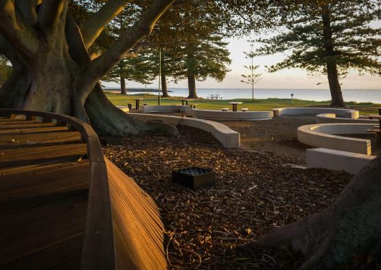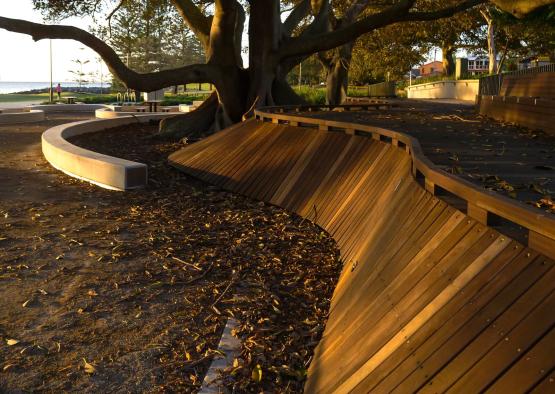 Ironbark decking provides a robust and contextual material for the boardwalk. The timber decking softens into the natural bushland setting. The boardwalk creates a wide and open space to navigate the park, while also protecting root zones for the trees. The boardwalk culminates at the beach between two heritage listed Moreton Bay Fig trees.