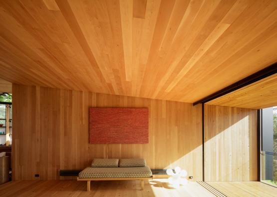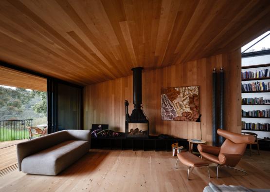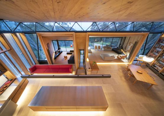 The home by Fitzpatrick and Partners is built using a modern structural system of structural cross-laminated timber panels and glulam columns. The structure is then finished with lining boards, joinery and furniture, which has all been made from timbers sourced from FSC plantations at the bottom of the Hydro lakes of Tasmania.