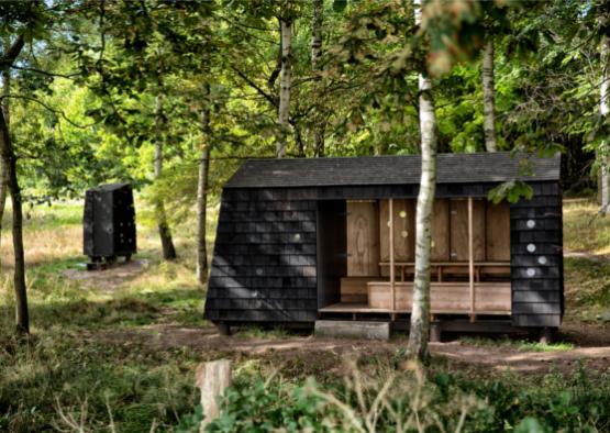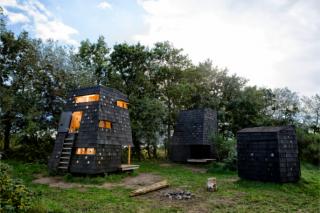 The buildings are clad in with large wood chips that have been treated with black-pigmented wood tar oil, giving them a unique dark steel-like colouration. Their slightly skewed lines create triangles and trapeziums in place of the expected squares and rectangles, which make the shelters seem less like man-made structures and more like natural rock formations or fire-blacked trunks.