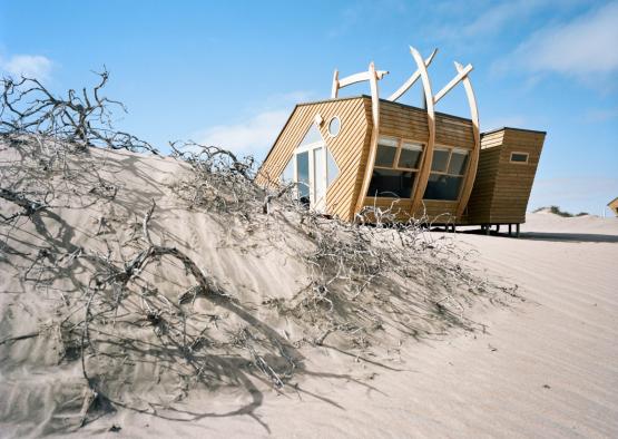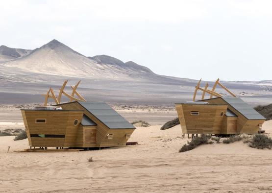 The location has a long history of harshness and treacherous human journeys. The aptly named Skeleton Coast, is famed for being home to hundreds of historical shipwrecks from journeys along the coast. The design response to the sight was to take inspiration from the wrecks, with the cabins forms reflecting that of a shipwreck.