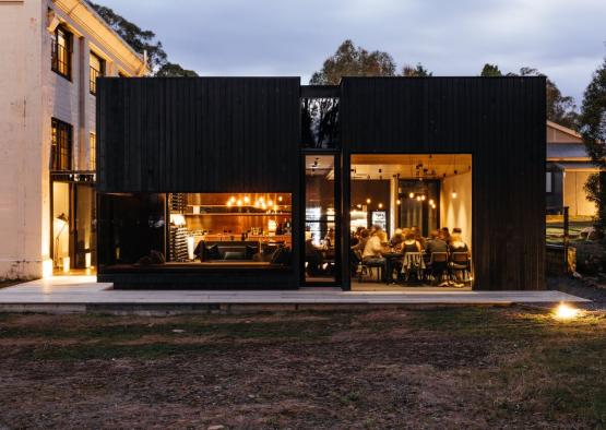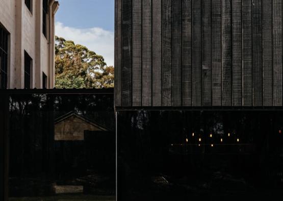 Vertical timber weatherboards have been stained black to produce a recessive and harmonious facade. The subdued palette soften the building into the landscape, allowing the historic Shorehouse building to take the lead.