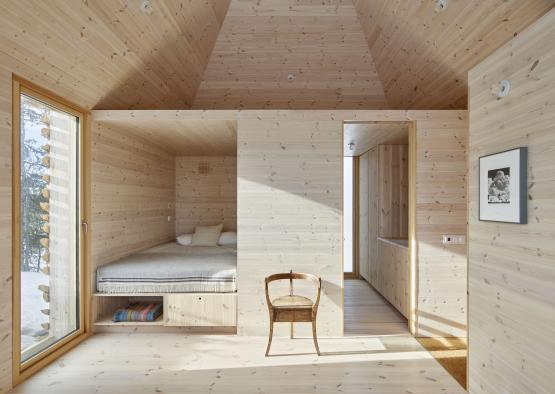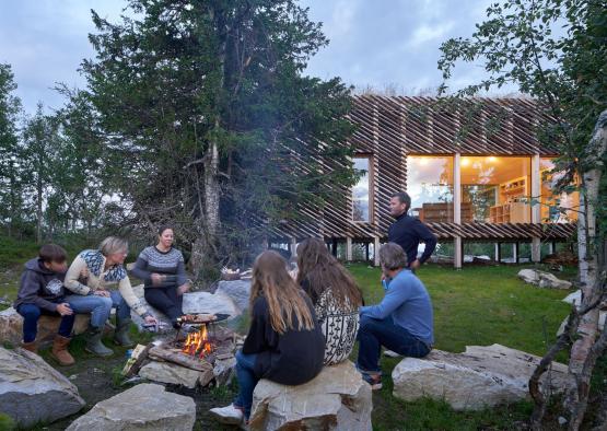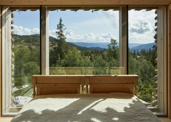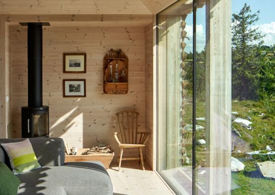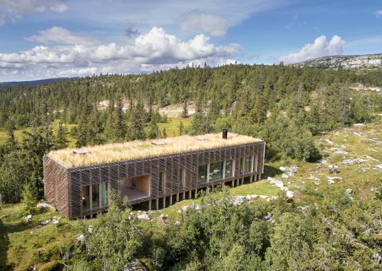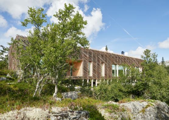 A contemporary take on a historic Norwegian mountain cabin that is made almost entirely from wood.