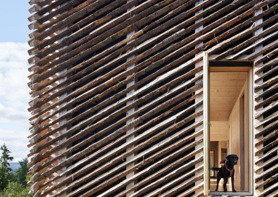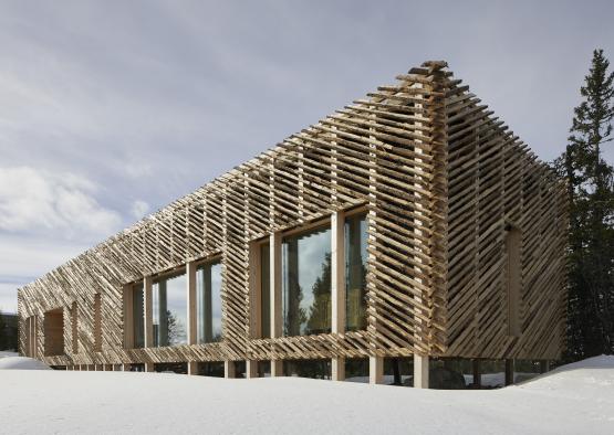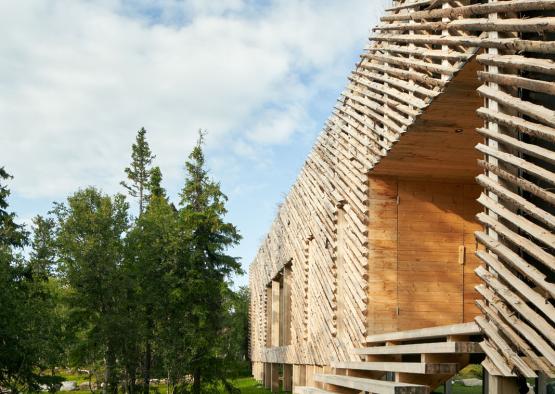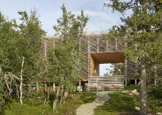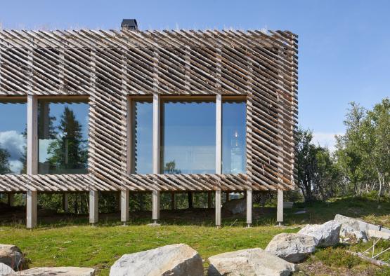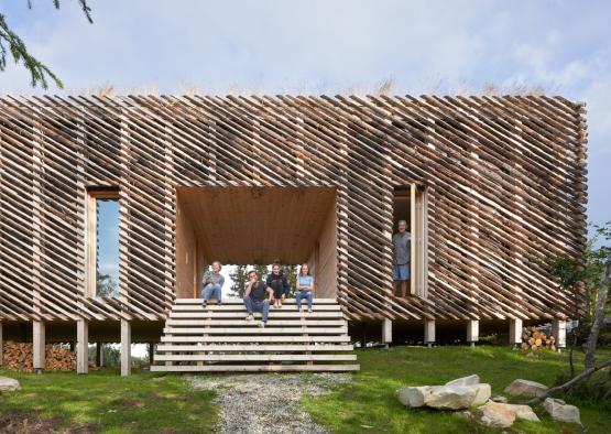 The project has been clad with ‘Skigard’. Skigard is a material typically used by Norwegian farmers. The long and narrow (typically 3m long) quarter-cut tree logs are traditionally laid out diagonally as fencing. The studio researched Skigard as a construction material in an effort to try to find examples of it being used as a cladding material, but were unable to find it used outside of fencing, which fed their desire to use the material differently.