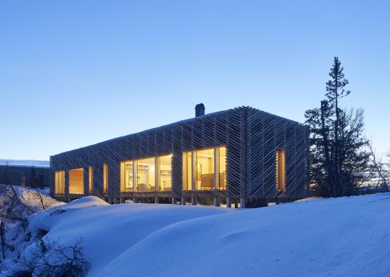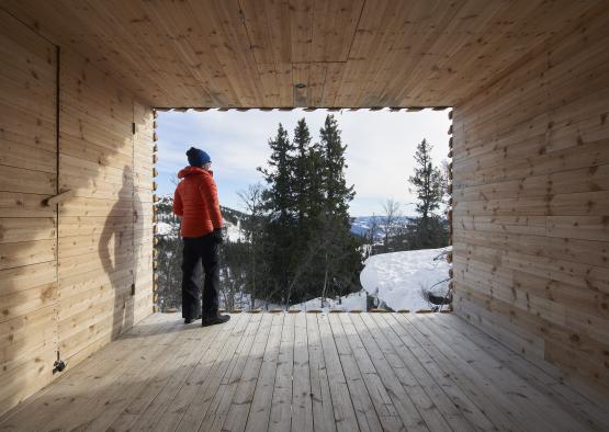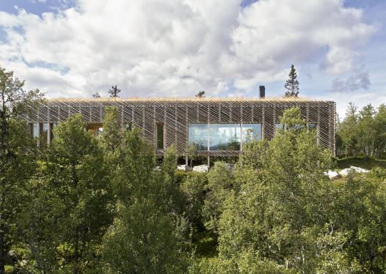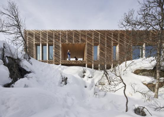 Skigard Hytte consists of a regular grid of timber columns. The timber columns raise the 145-square-metre house one-and-a-half metres up from the ground, in order to disturb the landscape as little as possible.
