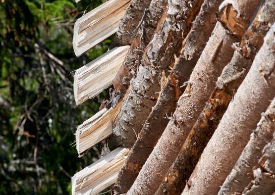 The concept developed into a log cabin skin, that sits protectively outside the building envelope. The small logs contrast the typical load-bearing element that defines conventional log construction.