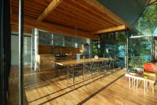 The objective of the interior design was to connect the inside of the house with its surroundings, creating an immersive experience. This is achieved not only through the generous use of glass, but with skylights built into the giant roof reaching up through the branches pulling in bright patches of the sun cutting through the tall trees.
