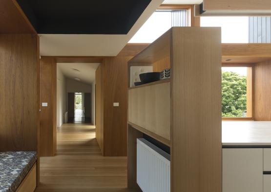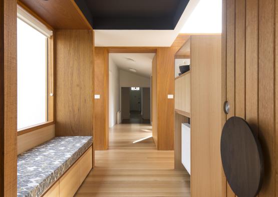 Select Tasmanian Ash veneered panels have been used for the kitchen joinery and window seats as well as for the exquisitely detailed and made pivot doors to the New Entry and Corridor.