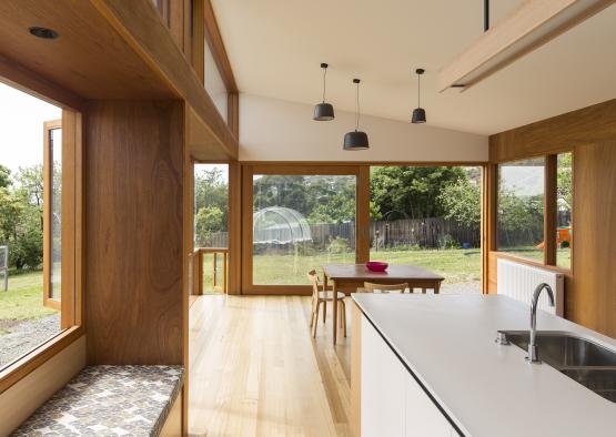 A variety of Tasmanian Oak timber windows and doors have been used externally and internally to the new timber framed and clad pavilion addition as well as for new doors to existing locations within the existing colonial period house allows a diversity of light, views, ventilation and engagement with the outdoors.