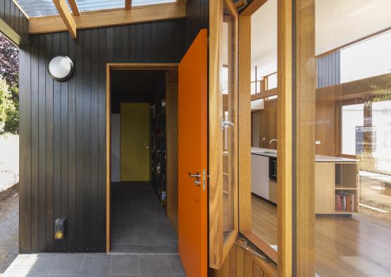The natural finish of the timber panels acts as a foil to the dark stained exterior of the new Pavilion Addition whilst also being a contrast to the white painted walls of the existing colonial period house.