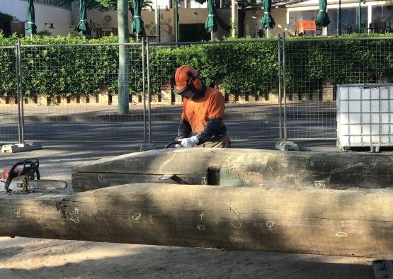 The timber pile was cut above the borer line, plumbed, and marked for a jointing plate to a new lower foundation. Two holes are vertically drilled into the new timber pile end grain to insert shear pins, and copper naphthenate (CN) oil is applied prior to jointing to prevent mould growth. To structurally reinforce the pile and protect it from further borer damage, TRS triple-wrapped the pile to weather protect the join. All timber member drill holes, end cuts and notches are also coated with the CN oil and sealed with a paraffin-based sealant.