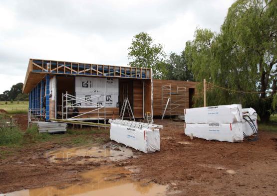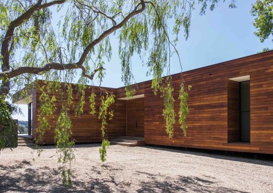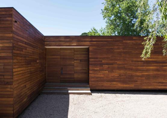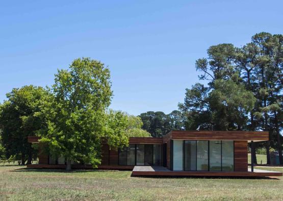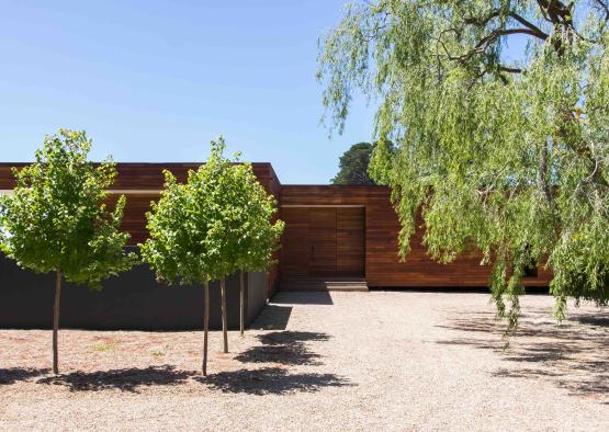 Surrounded by green paddocks and bushland, the natural colour grain of the Pacific Teak timber enlivens the spaces while referencing the rich landscape and natural surroundings.