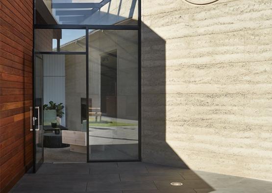 Rammed earth is another strong material in the mix, continuing the natural material selection. The earth provides a unity of texture both inside and out, and forms a strong relationship with the land. The rammed earth feature walls acts as a guide to a secret garden area, and provides a warm thermal mass for a winter friendly fireplace inside the complex. Locally sourcing materials was an important aspect of the sustainability process. Local stonework and locally sourced earth meant that materials traveled short distances, which reduced embodied energy.