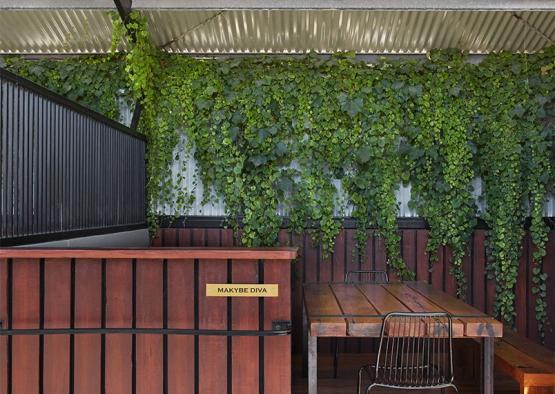 The former stables have been transformed into seating booths, and clad with salvaged timber from paddock fencing. The old fencing was also used to clad the entry gate, bench seating, and dining tables. The booths have been individually named after famed horses that have been trained at the site.
