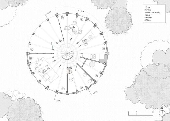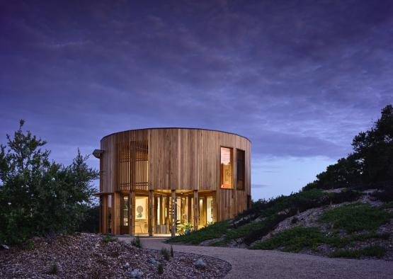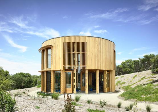 A circular home amongst the dunes of St Andrews Beach, referencing modest beach shacks found in New Zealand.