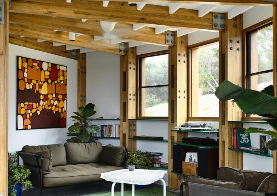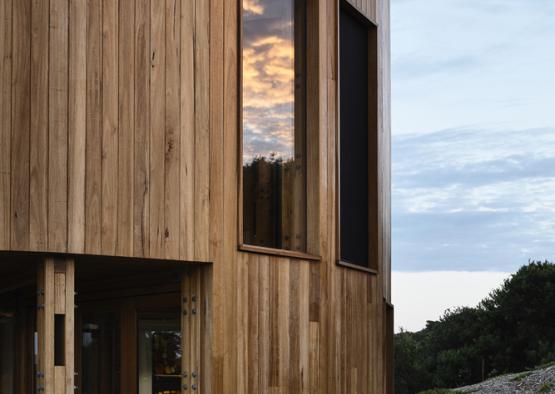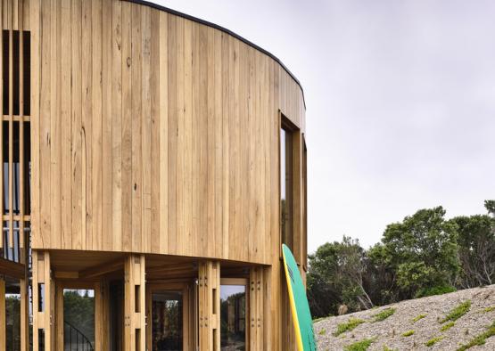 The exterior timber cladding, along with most of the buildings materials, are designed to weather and patina with age. The structure and context will continue to blend over time, extending the notion of the home falling into harmony with the landscape. Rather than opt for a slick beach home that perches arbitrarily, the informal timber dwelling will settle like an old wharf. Timber provides a durability and natural aesthetic common to the beach shacks dotting the Mornington Peninsula coastline.
