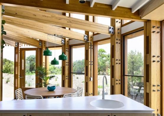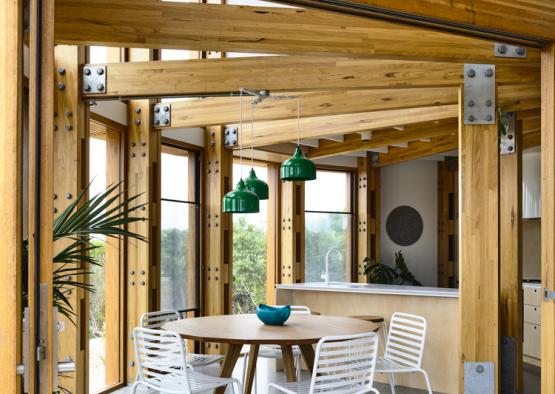 The post and beam structure is based on industrial portal frame construction. Engineered timber beams are joined with 8mm steel plates and coach bolts to create an extremely rigid joint, capable of high load resistance.