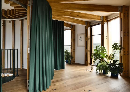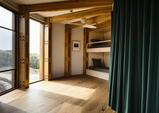 Once upstairs, the space becomes wholly open and adaptable. Curtains act as partitions between rooms, allowing the space to take on many forms. One large living space can be manoeuvred into three bedrooms. Timber flooring and plywood joinery create an earthy contrast to the plasterboard and glazing that alternate between the exposed timber posts. The portal frame posts meet in a central steel disk that binds the unique frame together.