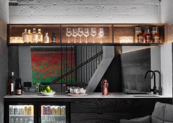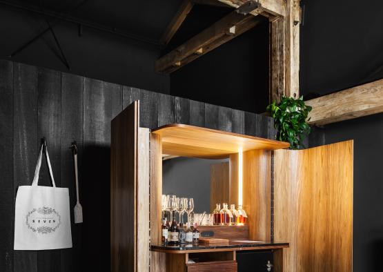Gullwing blackwood cabinets mingle with yakisugu tables, reflecting the strength of Tasmanian craftsmanship and design. The yakisugi table uses the traditional Japanese technique of wood preservation through the use of a charring layer from fire.