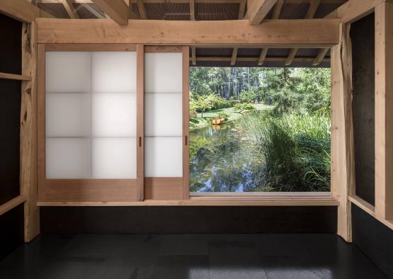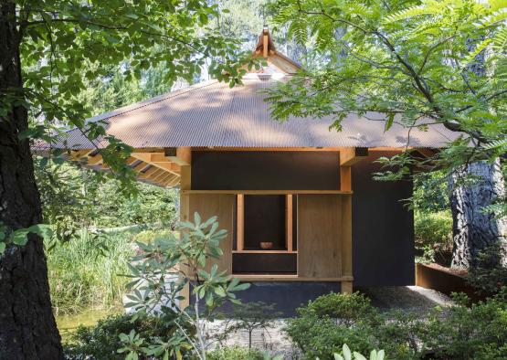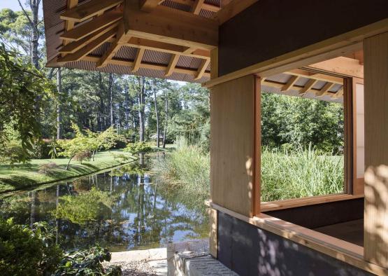 A generous copper roof supported by exposed timber rafters bestows shelter and directs runoff into the adjacent lake and gardens. Solid Monterey cypress was used to create the garden pavilion's traditional hip roof structure. The internal structure was intentionally exposed – with no internal ceiling – to form and define the structure's interior. The timber roof was clad externally in corrugated copper which may be viewed internally through the rafters, purlins and battens.