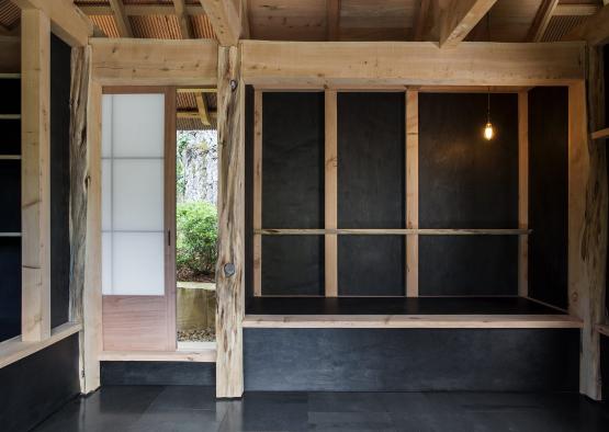 To provide warmth, texture and fragrance, traditional exposed timber post and beam construction made from solid Monterey cypress was used. Cantilevered bays maximise internal space – creating seats and alcoves for tea-making or works of art – while minimising the structure’s footprint to 6.8m2. Internal wall sections are clad in white russian birch ply. Sliding timber panels have been made from recycled Californian redwood and clad in translucent dacron.