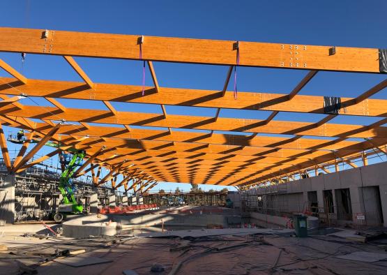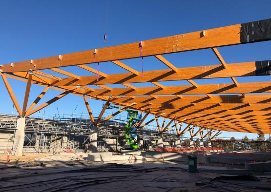 The roofing structure is composed of 47 metre main beams, spaced with 7 metre rafters. The entire structure is supported by tree-shaped engineered connections made of tapered glulam.