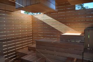 Timber was the only building material used throughout the structure and this homogeneity really makes light and its movements the hero of the project. Light peeks through the slatted exterior walls and plays upon each surface, encouraging the observer to contemplate its aesthetics.