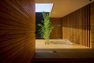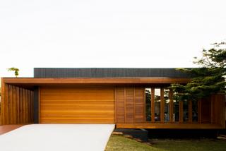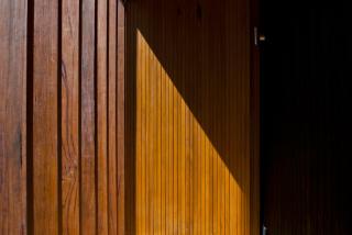 Timber is employed across the exterior of the Narrabeen house. In addition to the stained Cypress pine, Tallowwood cladding has also been used. Windows and doors are made from Rosewood, a hardwood chosen for its durability. Durable Tallowwood decks lead visitors through the main entrance, flanked by Tallowwood screens and columns. The door to the courtyard entrance is also Tallowwood. Boundary fences are made of plantation pine, adding to the sense of privacy.