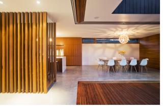 Timber fences and screens line a covered walkway to the central courtyard that comprises the main entrance to the house. Organised around this courtyard are a series of downstairs rooms, featuring various timbers. To the rear of the house, the kitchen and entertaining areas open out across the deck to welcome views of the lagoon and island beyond.