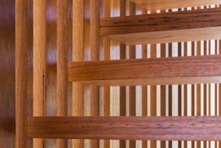 Wall panels of Tallowwood boarding are used alongside joinery constructed from Tallowwood veneer. The beautiful timber stairs, made from solid Blackbutt, appear to branch out of the Tallowwood walls.