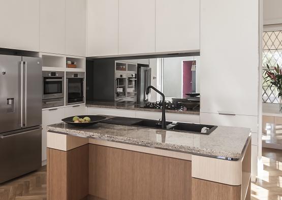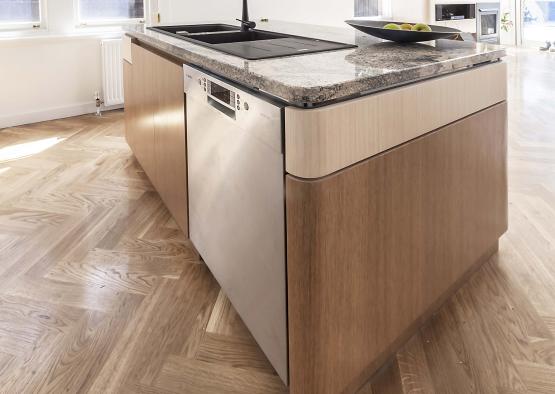 The Kitchen Island features two-toned reconstituted timber veneers from Ventech; Heritage Oak base with a slightly variegated rift grain, and a Snowflake highlight strip above, which features a more subtle dense rift grain. Intersecting at the end is a full panel of Snowflake back and shelves. All veneer panels are separated with matching shadow-lines. Together they complement the granite benchtop and marry the tones of the white cabinetry against the warmer oak parquetry.