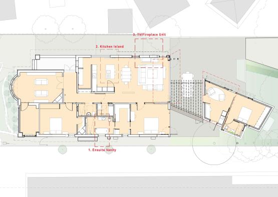 A suite of three timber-veneer joinery pieces was designed for the project. The pieces are originally inspired, when thinking of the main ensuite, by the client’s love of antique furniture and the ritual of a Victorian bedchamber with china washbowl and jug atop a turned-timber dresser. The idea was to recreate in joinery a contemporary vanity both as joinery-as-furniture, and joinery-as-heirloom, with the vanity featuring curved corners and a re-interpretation of the “white china washbowl and jug” as an integrated Corian top. This was extended to joinery pieces for the kitchen island and TV-Fireplace Unit.