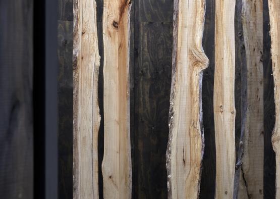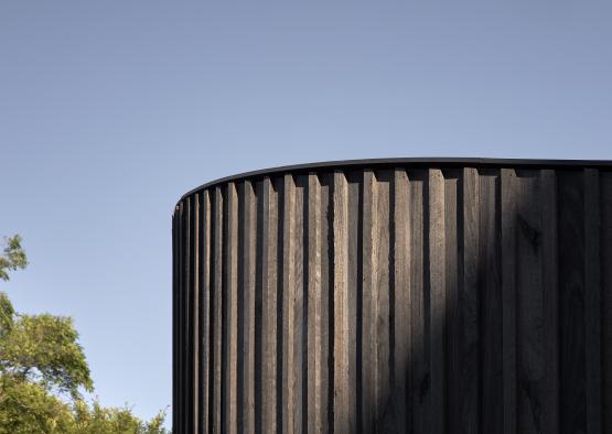 The blackened timber board exterior is created from timber salvaged from the 2019-2020 bushfires. The reused Victorian ash timber has rough sawn faces, adding to the story of their previous history.