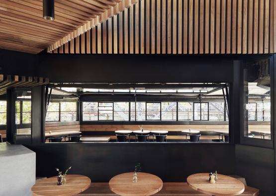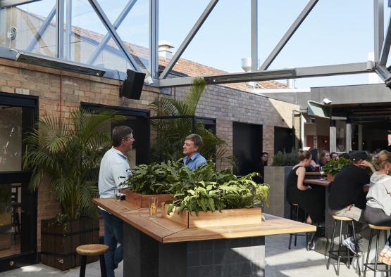 The rooftop bar of the Corner Hotel, located in the heart of Richmond, is a summer sanctuary. The outside, open area is decked out with timber planters, seating and tables, all crafted using FSC certified new regrowth blackbutt timber. This creates a welcome contrast to the surrounding 'concrete forest' of the CBD. Perforated acoustic Atkar ceiling panels were used to assist with sound control, as well as blackbutt ceiling battens. A separate function room to the side has engineered blackbutt flooring, with a multi-wall clear panel roof, giving the feeling of being outside. The internal panelling of the function space is done with Lohas panels, an environemntally friendly timber based board which is sound absorbent, making it both aesthetically pleasing and practical for a private function room. The revamped rooftop has brought the well known, and loved, live music venue a diverse new crowd for a refreshing change of pace.