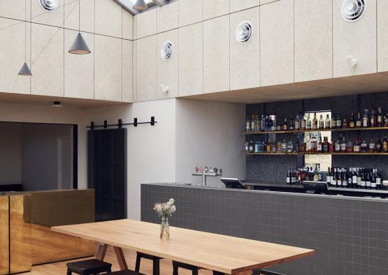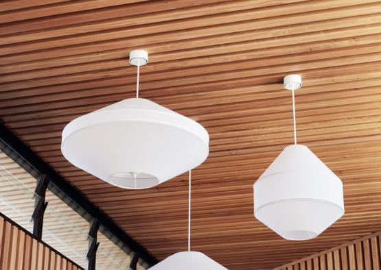 Interior Panelling: Atkar Au.diPanels, perforated blackbutt with veneer to face. Lohas wood wool cement board used for internal ceiling lining for its environmentally friendly and sound absorbent qualities.