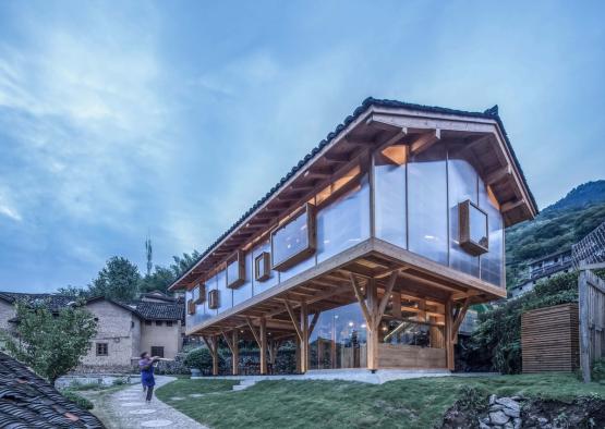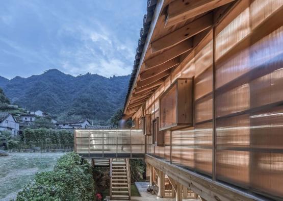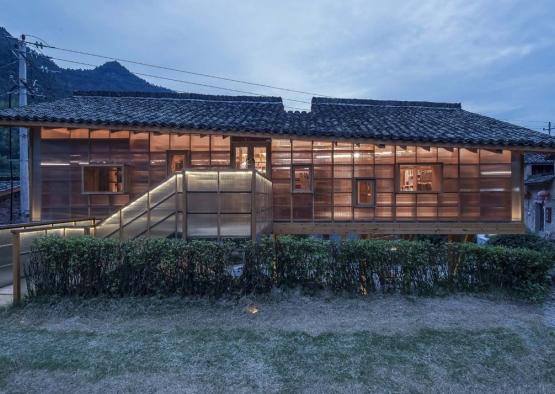 Chinese Studio Shulin Architectural Design has opted for a translucent finish to its book house in a remote mountain village in China. The building appears to levitate, raised up on timber columns, and lighting up the town like a soft paper lantern. Surrounded by historic rammed earth houses, the book house perches near the town square, creating a new public landmark for the ageing village.